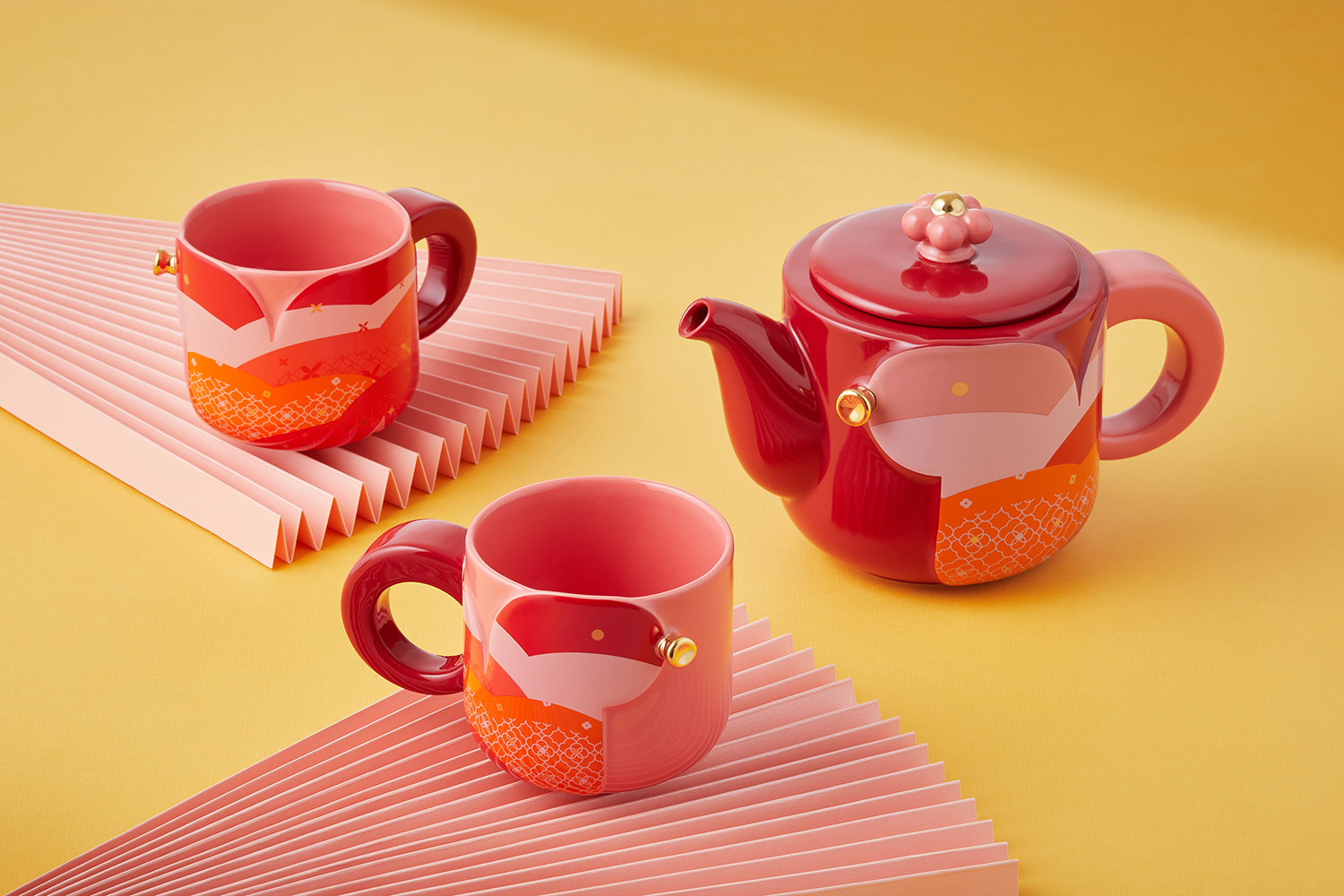 A slender serpent encircles the cup, its scales glittering brightly. Its design is inspired by balloons, which stand for freedom, passion, hope and dreams. The snake is a “little dragon” that sheds its skin, symbolizing rebirth. Here, its head and tail meet, representing completeness in life. The teapot is decorated with gold, and the lid knob is formed of golden flower petals, representing blessing and wealth.