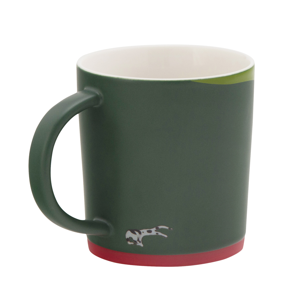 花貓慵懶溫順地趴在草地上,舔吮前腳,似乎無視於枝椏上的烏鴉;紅泥延伸至底部,與如茵綠草形成天寬地闊、自由徜徉的景象。本品含有風神秀雅(鴉)、吉祥喵喵招財進寶之美好寓意。