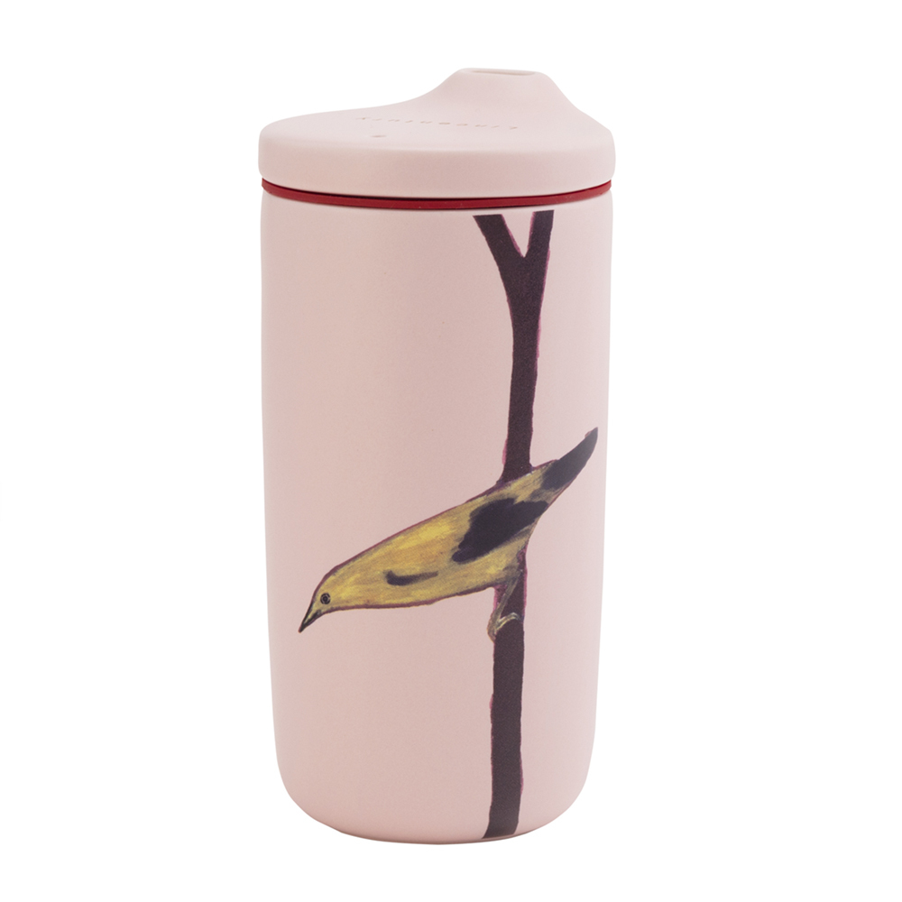 嫩葉初發,鳥兒穩穩停駐在鹿角枒杈般的枝梗上,鹿與祿諧音,寓意祥瑞。商品以帶著時光感的粉色系打底,咖啡色帶環繞杯身下緣,天圓地方的造型,極富東方色彩。另有一款杯盤組,簡單不失其韻味。