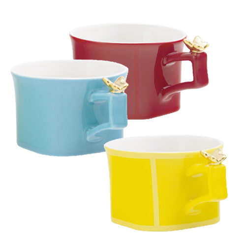 藉此衍生為具有強烈裝飾性的瓷盤、花瓶,及三件發想自青花瓷盆的杯子,把手上金蝶蹁躚,寓意福氣連綿。