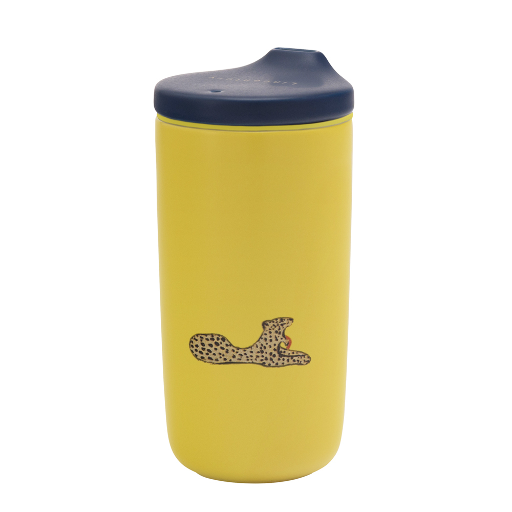 藍色夜空下,兩頭花豹帶著慵懶的神態,或趴或臥,優雅閒適,若有情似無意。商品將墨藍蒼穹設計成點心盤,疊搭在大塊黃土地杯子上,更加豐富了油彩本身的層次感。另外他款不同造型的杯組,其趣相仿。