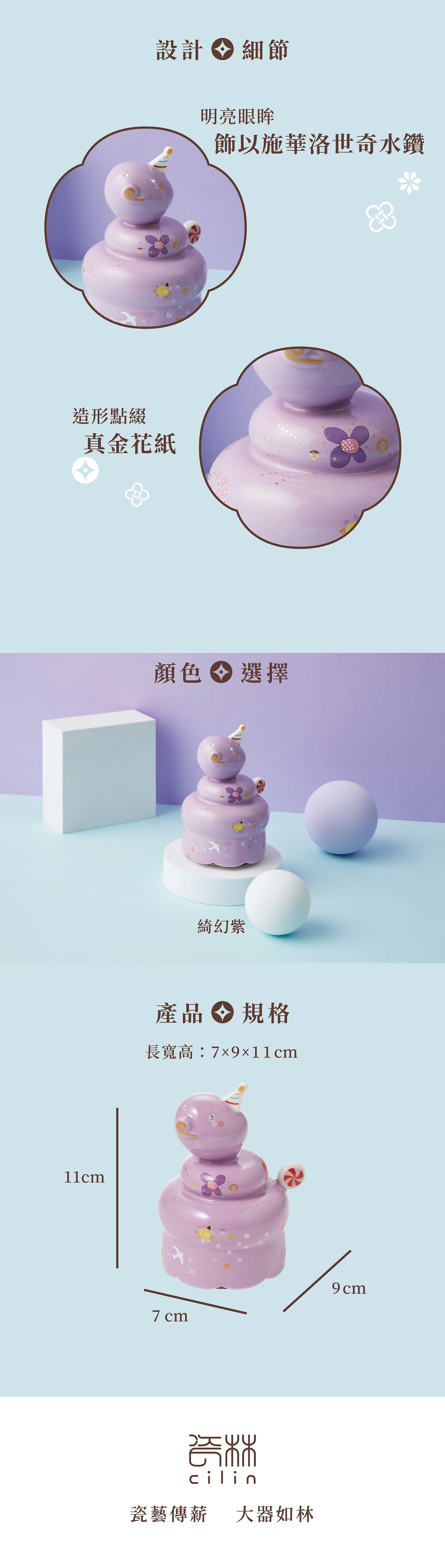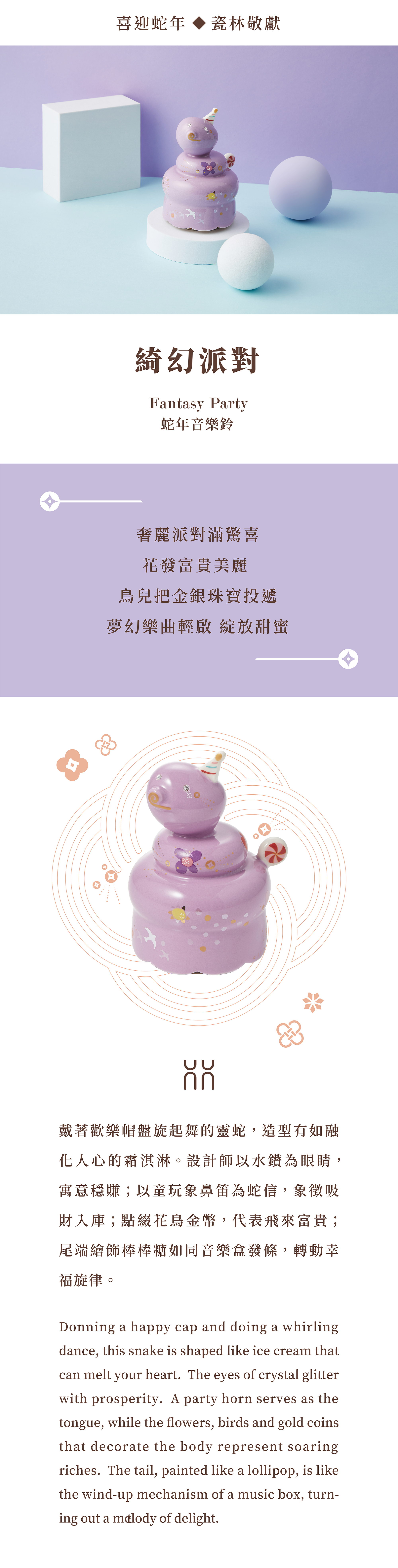 點綴花鳥金幣,代表飛來富貴;尾端繪飾棒棒糖如同音樂盒發條,轉動幸福旋律。