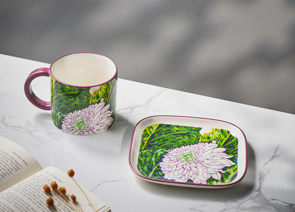 將大理花畫作轉為典雅杯盤組。渲染的葉片鬱鬱蒼蒼如翡翠,襯托細筆勾勒重重花瓣,更顯清麗脫俗不惹塵埃。