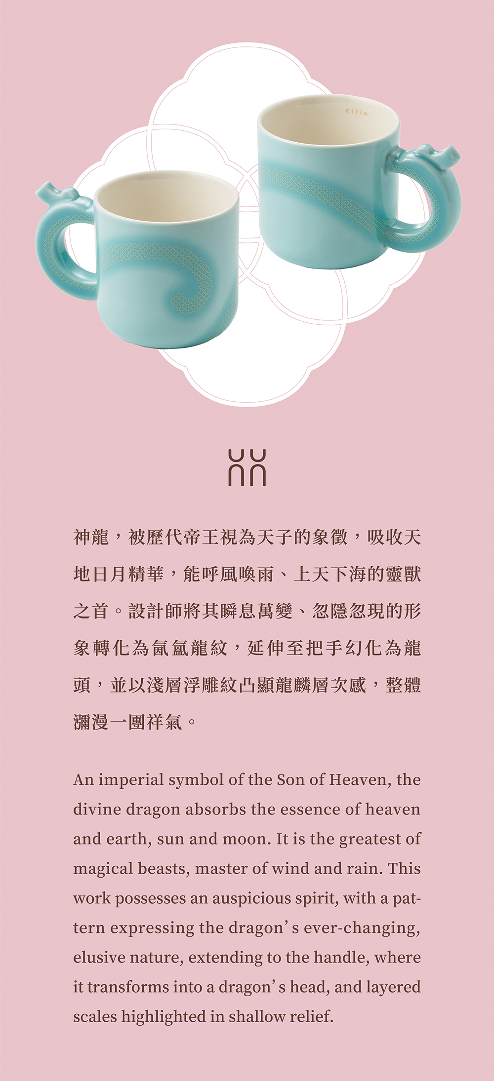 設計師將其瞬息萬變、忽隱忽現的形象轉化為氤氳龍紋,延伸至把手幻化為龍頭,並以淺層浮雕紋凸顯龍麟層次感,整體瀰漫一團祥氣。