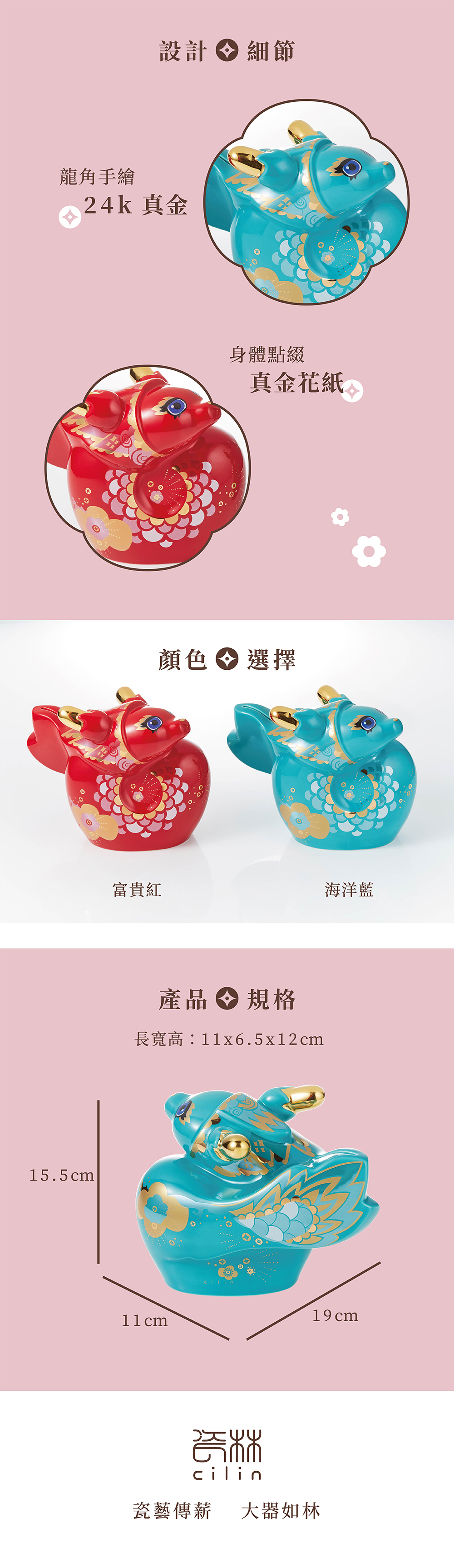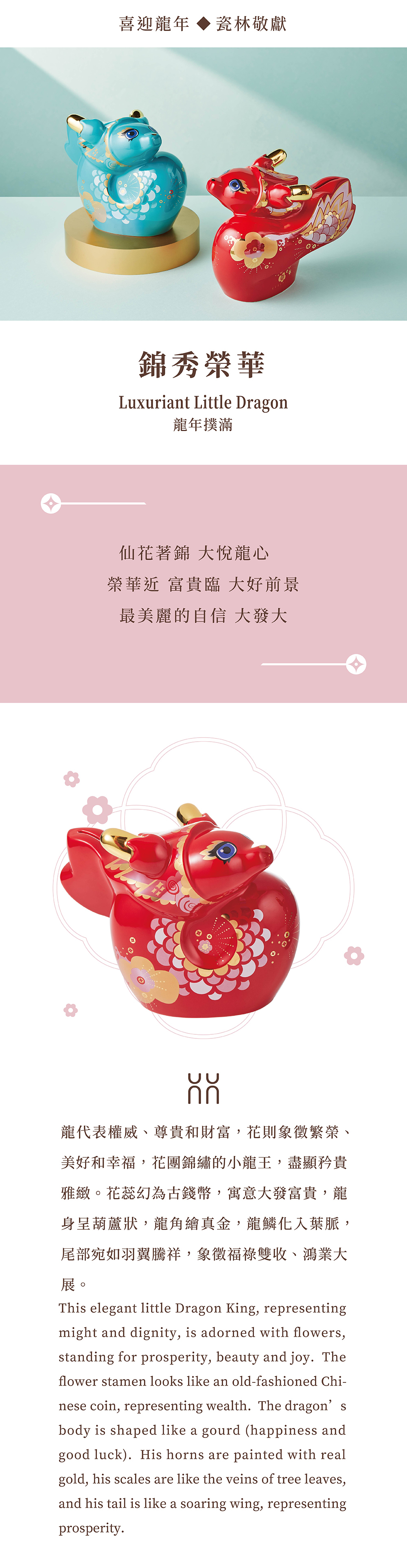 龍代表權威、尊貴和財富,花則象徵繁榮、美好和幸福,花團錦繡的小龍王,盡顯矜貴雅緻。
