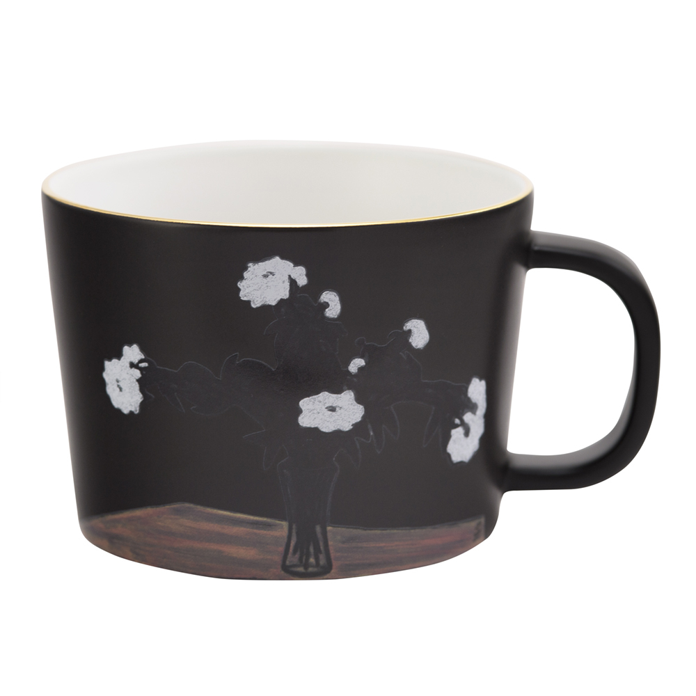 瑩白花卉兀自盛開,葉片與背景僅用不同明度的黑做區隔,玻璃瓶以黑線勾勒,黃褐色桌面猶帶底色刷痕;由此作衍生而來的商品,大氣雍容,杯口繪飾金線是對常玉的至高禮讚。
