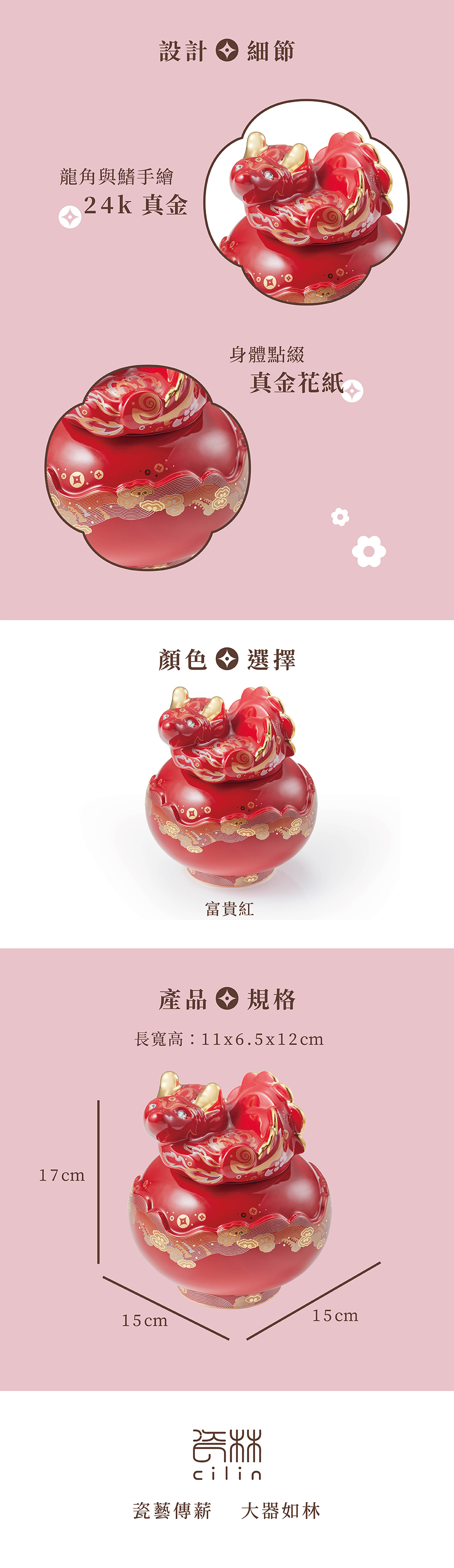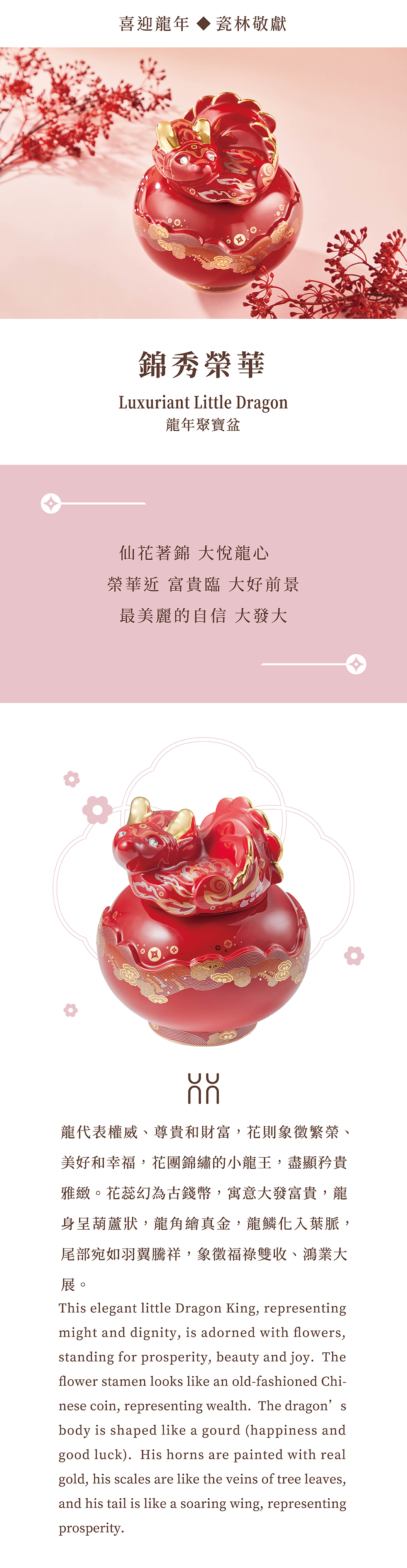 龍代表權威、尊貴和財富,花則象徵繁榮、美好和幸福,花團錦繡的小龍王,盡顯矜貴雅緻。